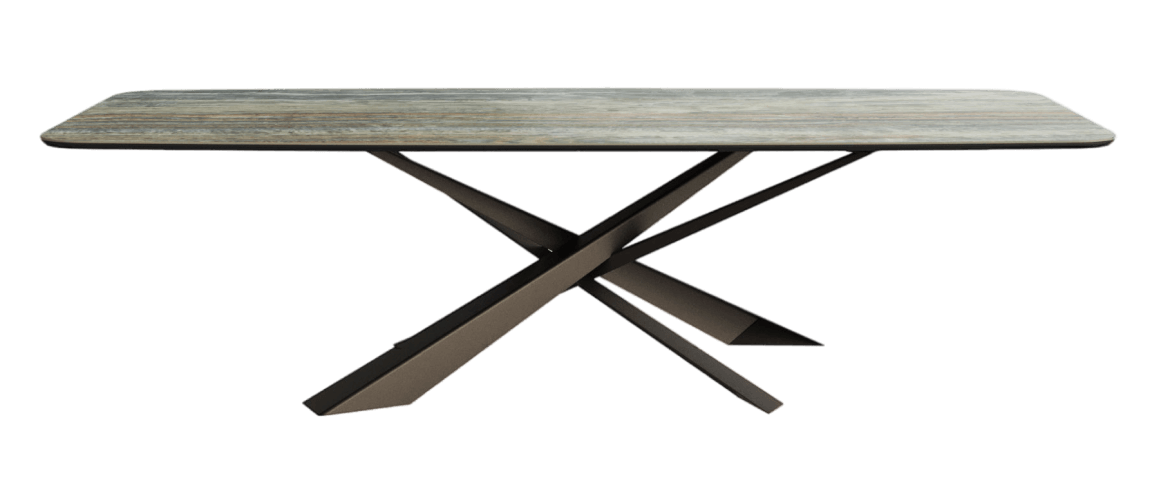 Премиальный обеденный стол по индивидуальным размерам. Нераскладной обеденный стол с керамической столешницей и стальными опорами. Современная модель с архитектурным внешним видом, где четыре непересекающиеся опоры рассекают пространство, создавая энергичную композицию с непревзойденным и эксклюзивным рисунком столешницы. Смелая эстетика, не боящаяся привлекать внимание